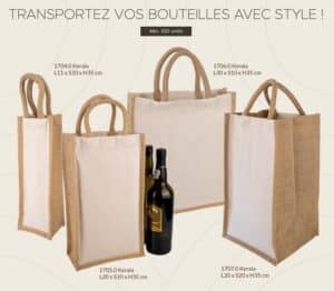 SACS Cabas Bouteille(s) avec Anses 1 – 2 – 3 – 4 Bouteilles en Toile de Jute naturelle 100% avec 2 faces Coton 320g/m2 personnalisables.